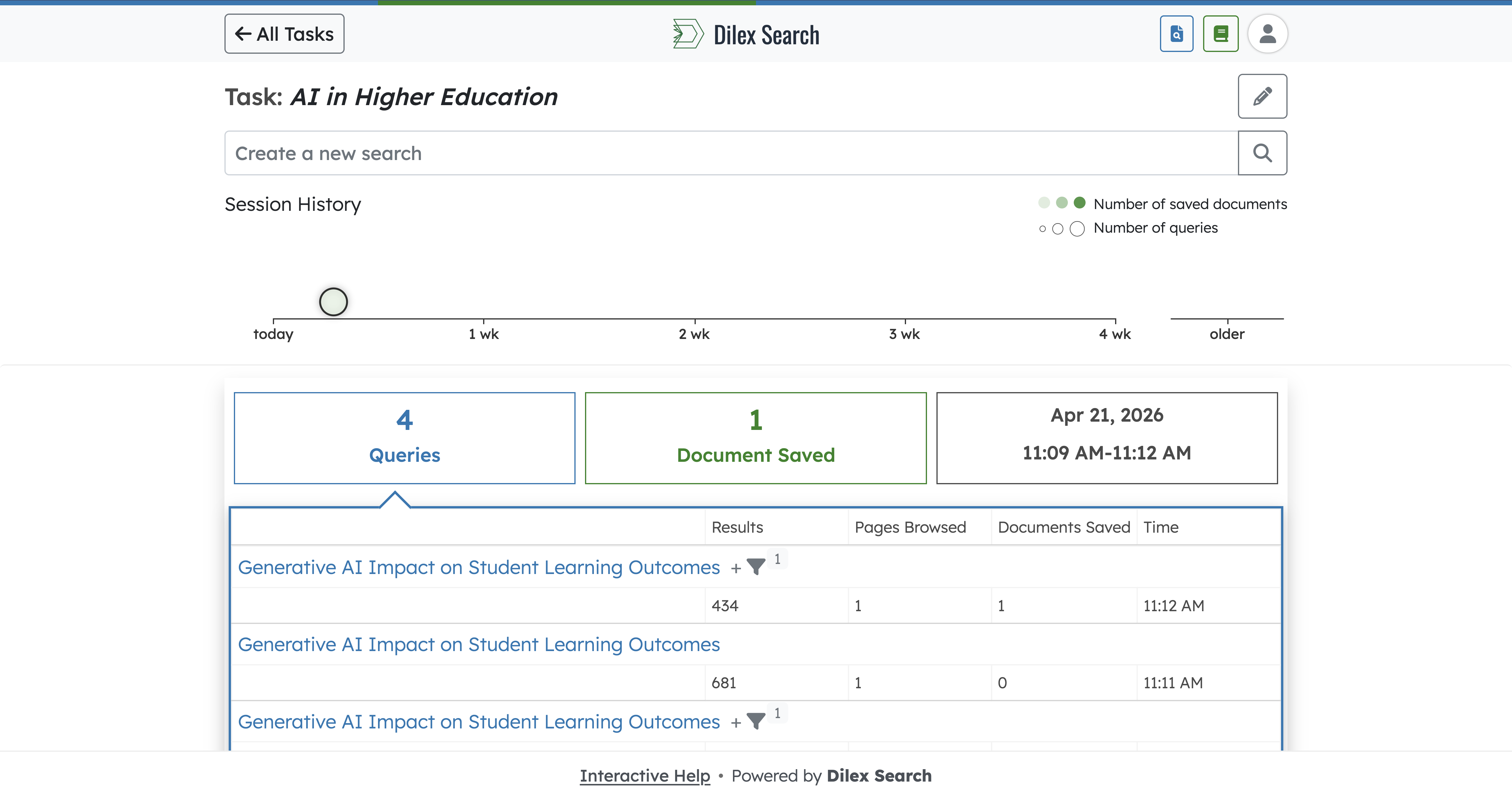 A comparative user study between Dilex Search and the standard Ex Libris Primo interface revealed significant benefits in user engagement, especially when searchers needed to stop and resume tasks. These results were published as a full paper at the top worldwide conference on information retrieval.